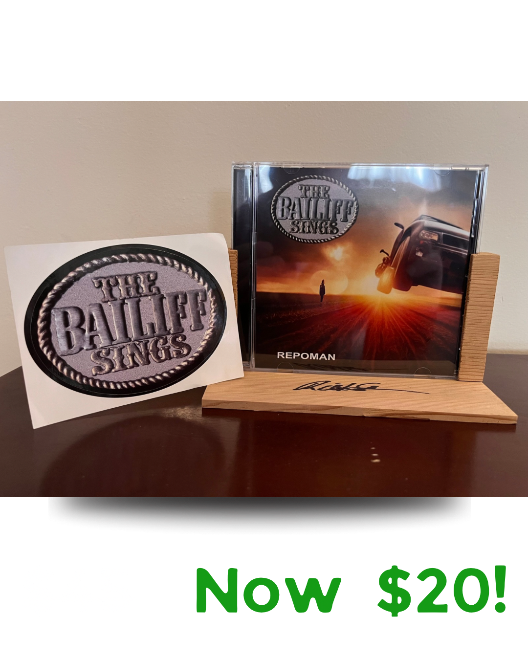 Complete the trilogy by adding my “Repoman” CD along with a sticker and handcrafted CD holder built by me in my wood shop!